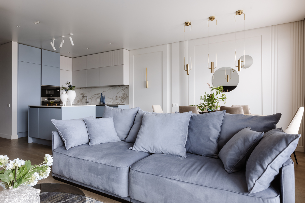 Диван в приглушённом серо-голубом оттенке задаёт характер пространства и становится центральным элементом зоны отдыха. Нейтральная база и тёплые акценты позволяют интерьеру оставаться спокойным и сбалансированным.