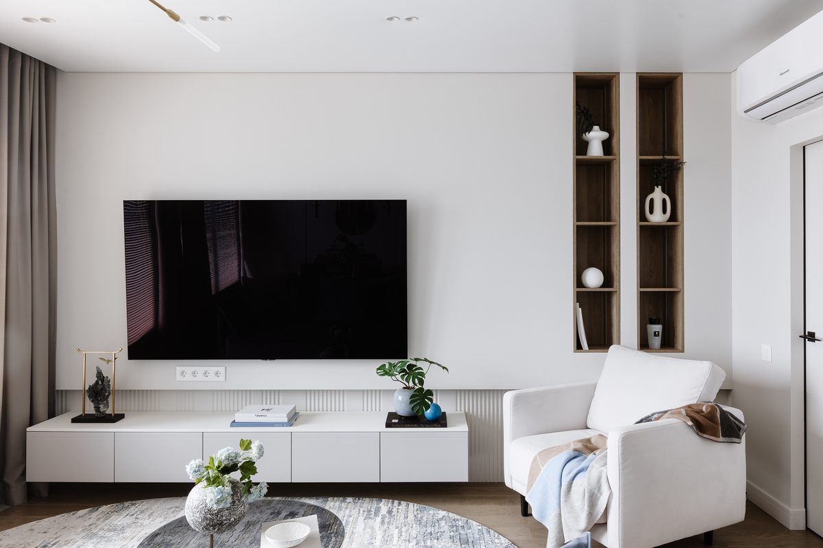 Для ТВ-зоны реализована подвесная система хранения и открытые ниши — все элементы выполнены по индивидуальным размерам с учётом особенностей помещения.