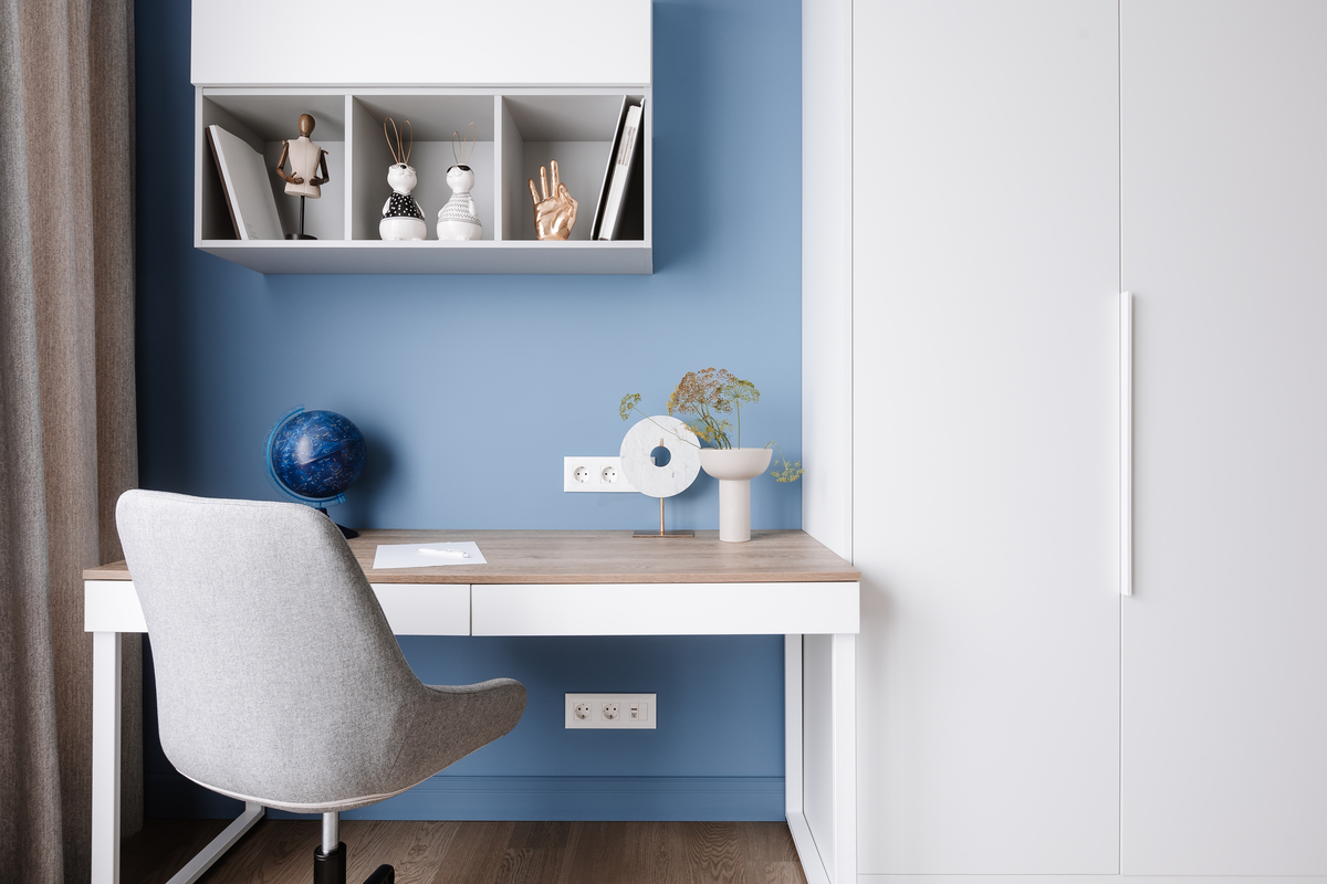 Интерьер построен на сочетании светлой базы и акцентного голубого оттенка, который задаёт характер пространству.