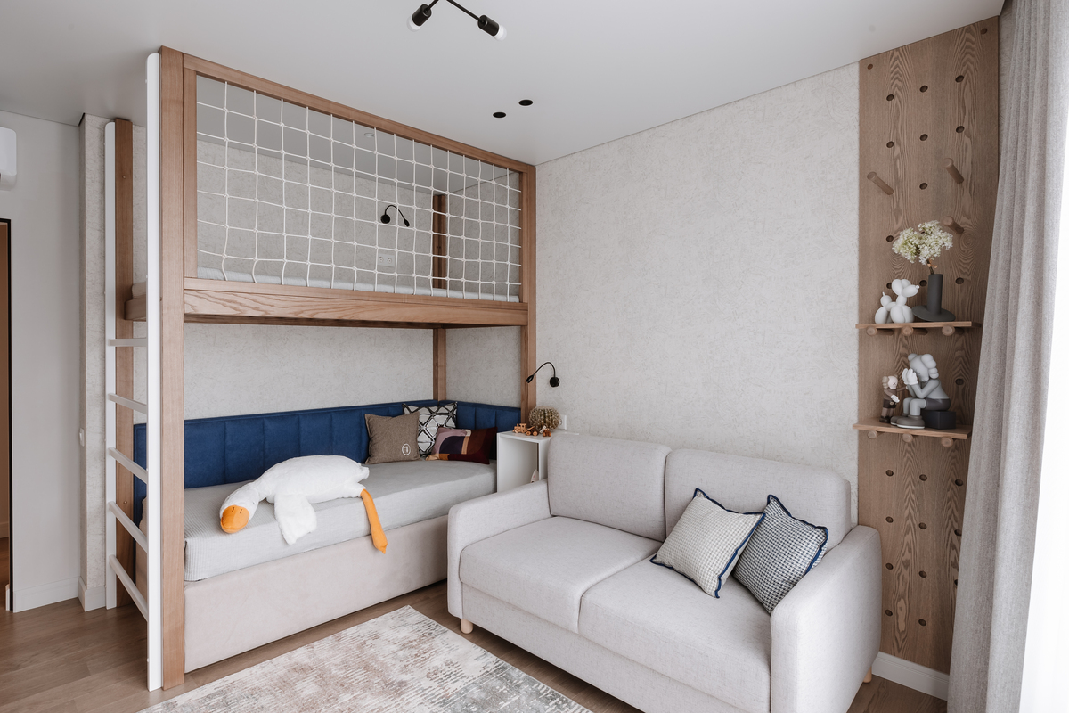 Кровать с верхним ярусом позволила разместить спальное место и зону отдыха, сохранив свободное пространство в комнате.