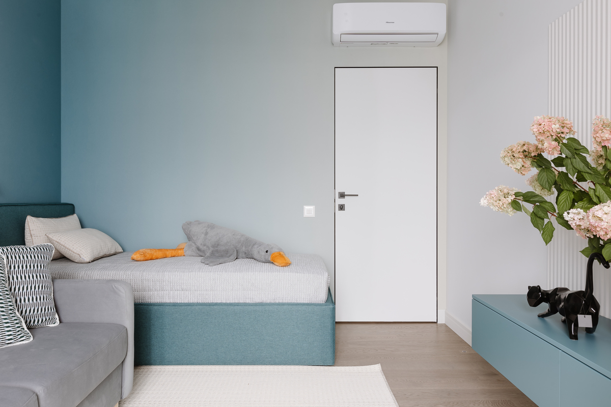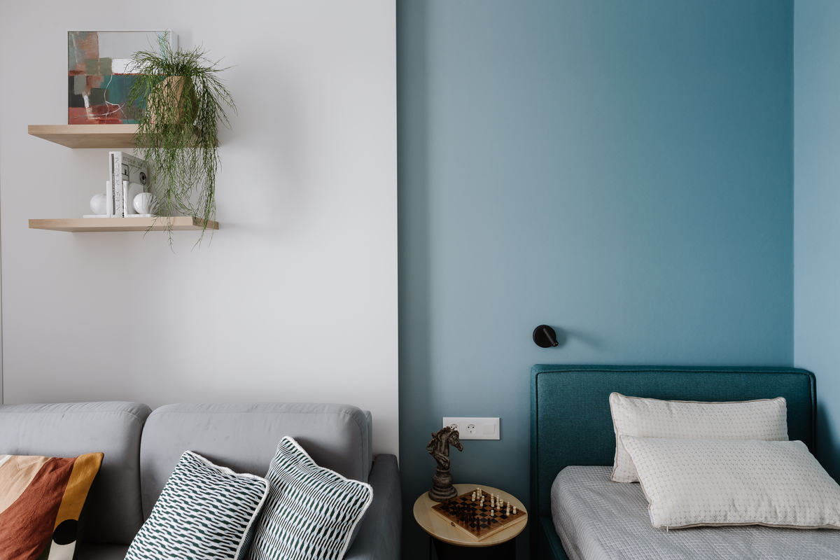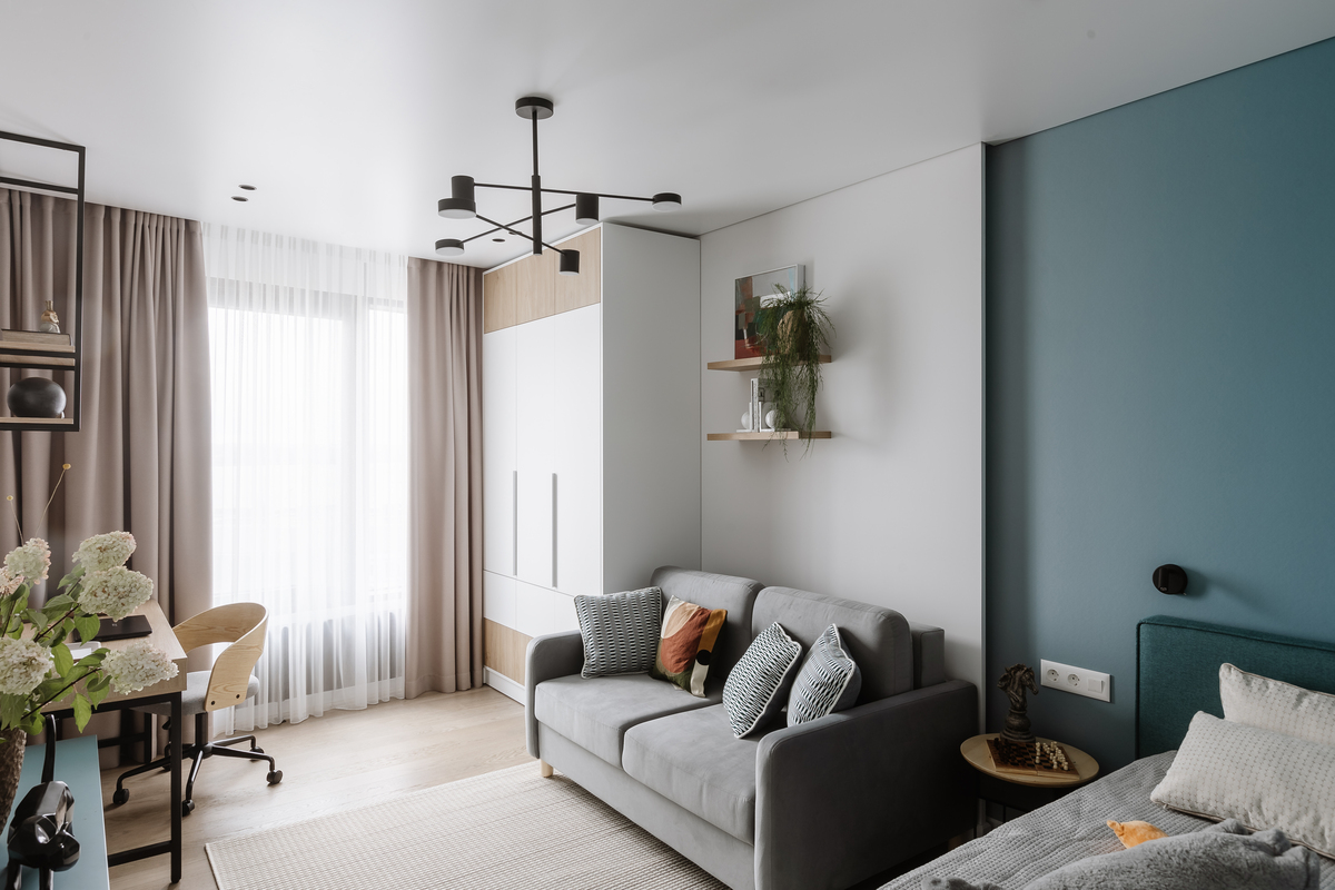 В этой комнате цвет работает мягче — сочетание светлых стен с приглушённым бирюзовым акцентом делает пространство более спокойным.