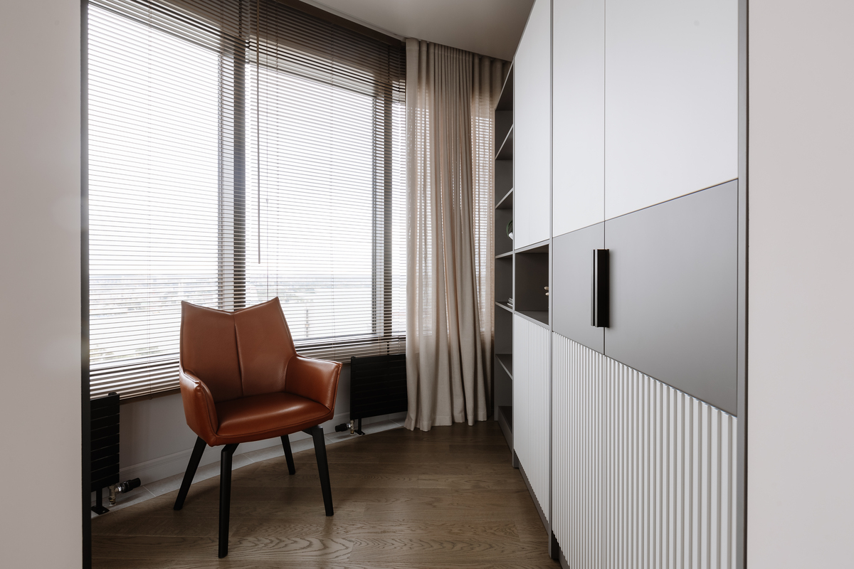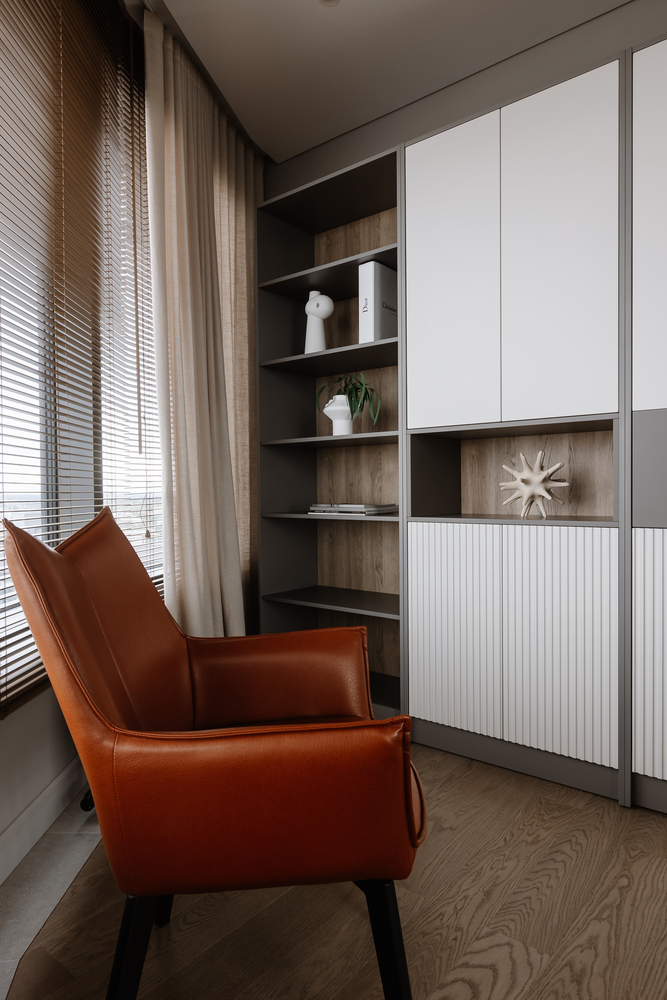 Здесь использована более контрастная палитра: тёплое дерево, графичные элементы и акцентное кресло формируют характер пространства. Система хранения выполнена по индивидуальным размерам и сочетает закрытые фасады и открытые полки.
