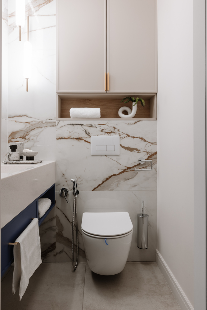 Санузел компактный, но функциональный. Встроенные системы хранения позволили максимально использовать пространство и сохранить аккуратный внешний вид.