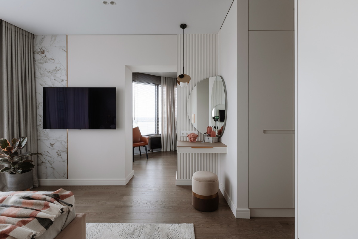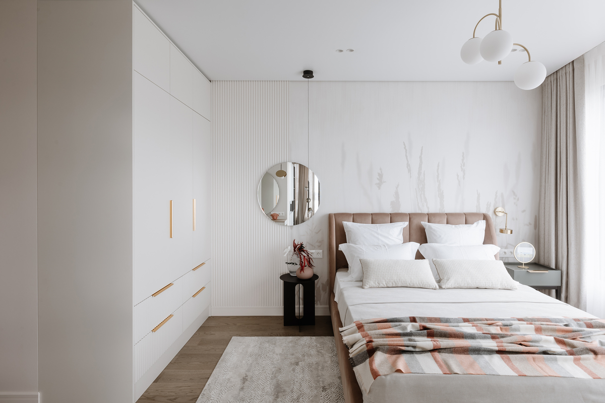 Интерьер решён в спокойной тёплой гамме: светлая база, мягкие текстильные оттенки и акценты в латунной фурнитуре формируют ощущение уюта и приватности.