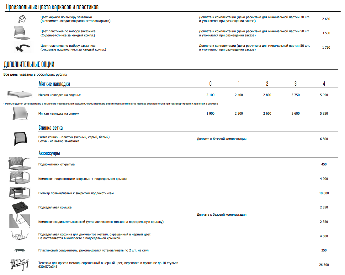 • Сиденье и спинка из высококачественного пластика; возможна установка сменных мягких накладок.